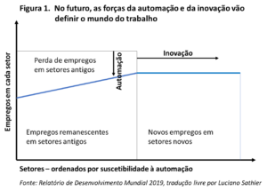As tecnologias digitais permitem que as empresas se automatizem, ao substituir o trabalho humano por máquinas. Ao mesmo tempo ampliar as oportunidades para inovar, pois expandem o número de trabalhos, serviços e produtos. O futuro do trabalho será determinado pela batalha entre automação e inovação – veja a figura mais abaixo. Em resposta à automação, declina o emprego em setores antigos. Já com a inovação, surgem novos setores e novos trabalhos.